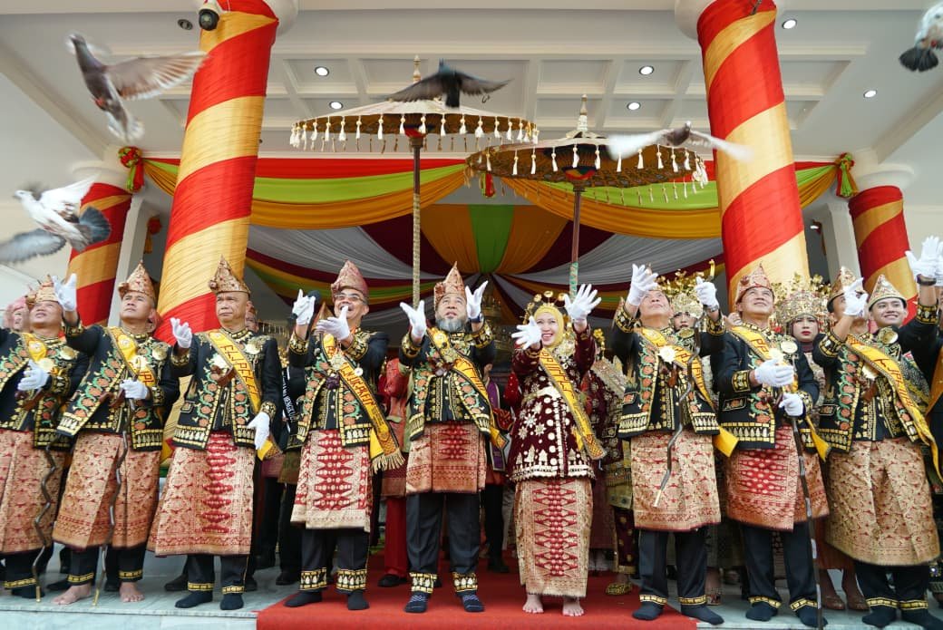 Pemberian gelar adat ditandai pemasangan detar dan penyematan PIN sebagai simbol kehormatan adat.